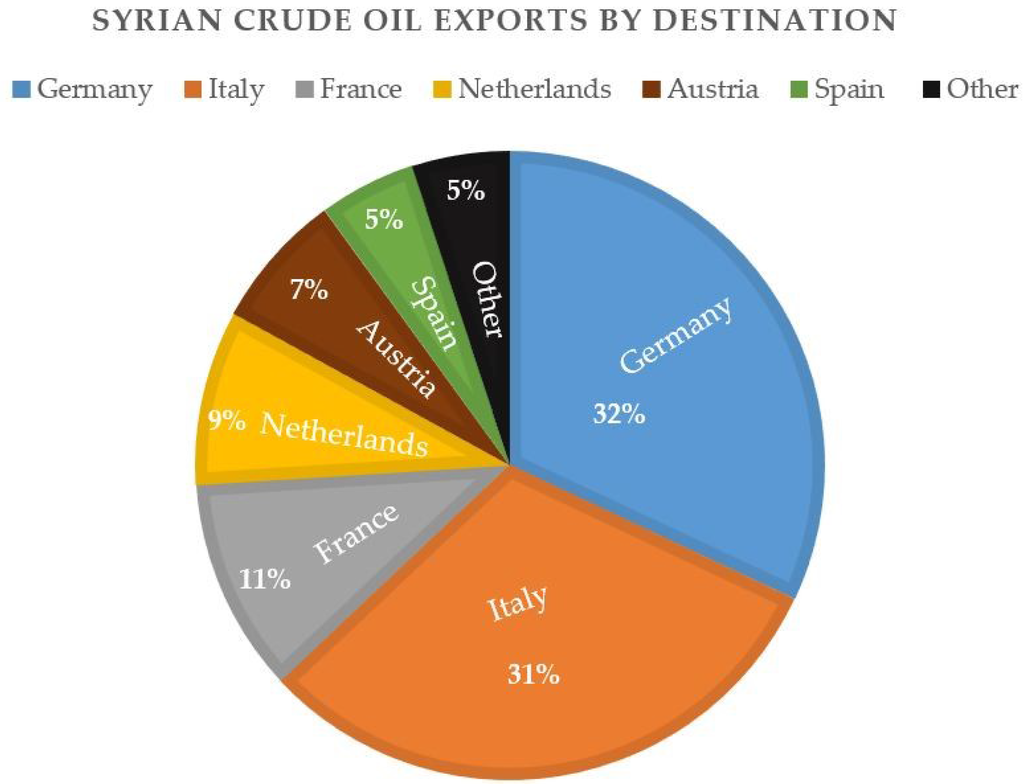 Although not a large oil producer or exporter on the world market, Syria produced pre-war approximately 400,000 barrels per day (b/d) of crude oil from its oilfields in the eastern part of the country, near the Iraqi border, while exporting approximately 150,000 b/d of crude oil, virtually all over Europe [1]. Estimated net crude oil exports were 109,000 bbl/d in 2010, the vast majority of which went to the Organisation for Economic Co-Operation and Development (OECD)’s European countries. Germany, Italy, France, and the Netherlands received over 80% of Syria’s crude oil exports. According to the European Commission, European Union (EU) countries imported 1.35% of their petroleum from Syria in 2010 (Figure 1). Although exports from Syria represented a small share of the EU’s overall oil needs, these exports accounted for 30% (or $4.1 billion) of Syrian government revenues in 2010 [2].