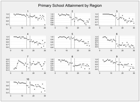 Primary school attainment by region of residence: Regions: 1 = Kampala, 2 = Central 1, 3 = Central 2, 4 = East central, 5 = Eastern, 6 = North, 7 = Karamoja, 8 = West-Nile, 9 = Western, 10 = Southwest. Note that the figures on the y-axis are rounded to one decimal point.