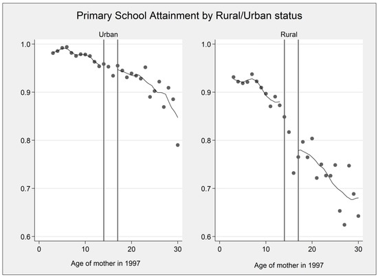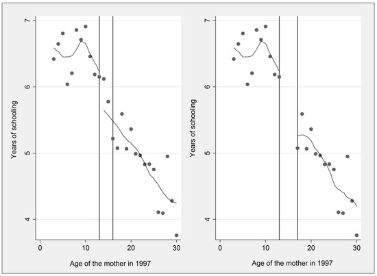 Figure 4 shows the influence of the 1997 UPE policy on motherly learning in Uganda using data from the waves of the UDHS conducted in 2000/01, 2006 and 2011 [59,60,61]. The two perpendicular lines shown represent the age 14 and 16 markers. To the left(right) side of these lines lies the treatment(control) group. Figure 4 appears to show a fall in schooling from age 16 in 1997. We can observe that women who were 13 years and under in 1997 acquired more years of schooling compared to their counterparts aged 17 and above in 1997. The observed jump in completed years of education seems to overlap with the sharp decline in under-five mortality shown in Figure 3. This discontinuity is even clearer if we consider the graph excluding women in 14–16 age bandwidth.