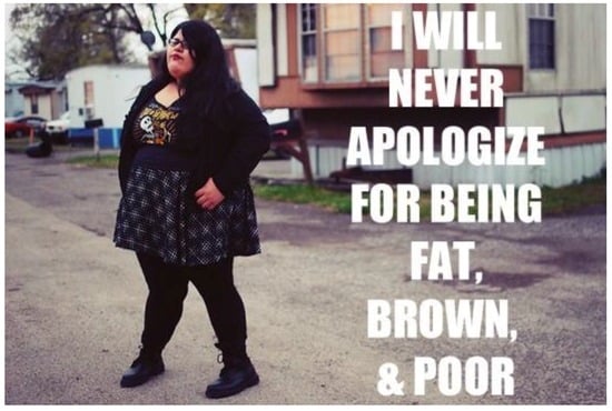 Marisole’s post (Figure 3) discusses the additional issues that contribute to the construction of fat bodies in American media. As earlier literature has shown, fat people are viewed as lazy or morally reprehensible [4,10,11]. In the minds of most, fat people are fat by choice. They choose to overeat or not to work out. Fat by choice is often not the case, as many struggle with inadequate food choices because of income constraints. Still, many are fat by choice or by some other contributing health factor and yet they are still healthy. Discourse on this webspace offers people of color a space to negotiate their own personal definition of health and size while being mindful of all of the various social roles that they occupy. Elements of Marisole’s photo and accompanying description specifically allow for a discourse on poverty and size. Marisole’s stance is one that is resistant to the idea that women should take up less space, with legs firmly planted and hands on hips. The setting of the image, a mobile home park, also directly engages the poverty narrative that dictates that one should be ashamed of their social standing or income, and clearly she is not. The words placed over the image remove any doubt about the discursive nature of the photo: “I will never apologize for being fat brown & poor”. Instead of succumbing to the expected societal norms, Marisole has decided to resist. The 3317 reposts of this image on various blogs across Tumblr are indicative of literal and figuratively shared resistance.