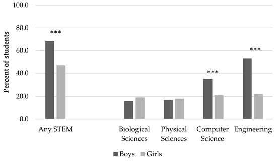 Labor market analysts have been sounding the alarm regarding the need for more workers trained in science, technology, engineering and math fields (STEM) for more than a decade, as the U.S. economy is increasingly reliant on innovation and growth in these fields [1,2,3]. Researchers in several disciplines have attempted to understand why, despite the high demand and the accompanying high status and income associated with careers in many STEM fields, the percent of students choosing to study these fields in college has remained stagnant, or even decreased in some cases [4]. Additionally, as women remain greatly underrepresented in many STEM fields, there is a large public as well as academic discourse regarding the obstacles to recruiting and retaining female students [5,6]. Of course, the roots of the problem extend far back beyond the labor force and the postsecondary realm, as research indicates that young people make decisions quite early about whether they intend to pursue STEM fields in the future [7,8]. Though the notion of a STEM pipeline has been rightly critiqued for being too simplistic, it is nevertheless clear that adolescents’ early decisions in this regard are highly predictive of their subsequent behaviors. So what factors motivate young people to choose to study STEM fields, and why are female students much less likely to make such choices?