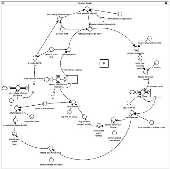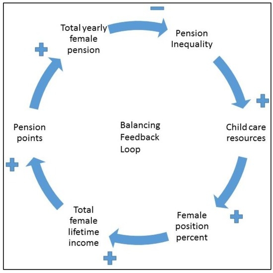 The CLD in Figure 5 indicates that women are at a structural disadvantage in terms of future pension payments. Only those women who want to contribute to the welfare system with labor force participation (and hence contributing to social investment strategy) will achieve higher pensions. Women must adhere to social investment strategy with labor force participation, where there is the defamilialization of care [23]; and if they choose not to adhere and provide childcare themselves, their lifetime earnings and hence pension will suffer. Even if women do adhere, care work at home is still largely the responsibility of mothers, which leads to higher rates of female part time work in childbearing/rearing years.