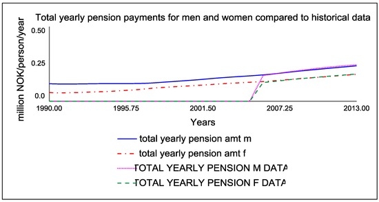Figure 1 shows the stock and flow diagram of the section of the Norwegian pension system that represents how total lifetime income is accumulated for men and women. Total lifetime income for men is the stock on the left, and total lifetime income for women is the stock on the right. Total lifetime income is the largest determining factor for pension payments. Men and women earn different levels of pension as shown in Figure 2. Total yearly pension payments are simulated in the model in Figure 2 (blue-men and red-women) with the historical data (pink-men, green-women, no data before 2006).