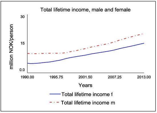 Total lifetime income for women (blue) and men (red) in Million NOK/person.