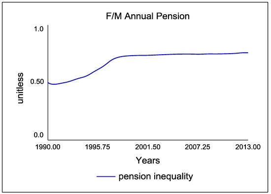 “Pension inequality” is the ratio between male and female pensions. The goal is to have this equal 1 (equal female/male pensions). The graph in Figure 4 shows the behavior of this over time. The simulation runs until 2013, with the ratio at 0.75.