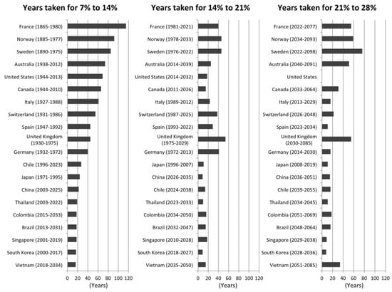 Number of years taken or predicted to take for three aging transitions in selected countries. Note: Created from the Organisation for Economic Co-Operation and Development (OECD) and UN demographic database. Years in parentheses are the periods during which each aging transition occurred or is predicted to occur.