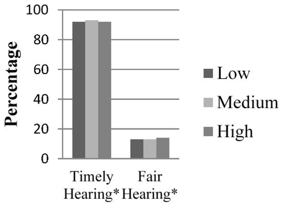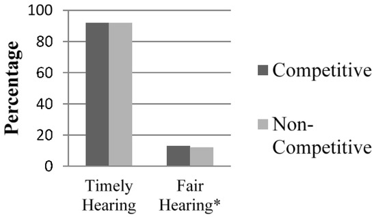 Table 2 reports logistic regressions at a 95% confidence interval for timely and fair outcomes. The predicated correct percentage for both models was strong with 92.1% for timely hearings and 86.7% for fair hearings. The model fit, however, was much more significant for the model assessing fair hearings than timely hearings.