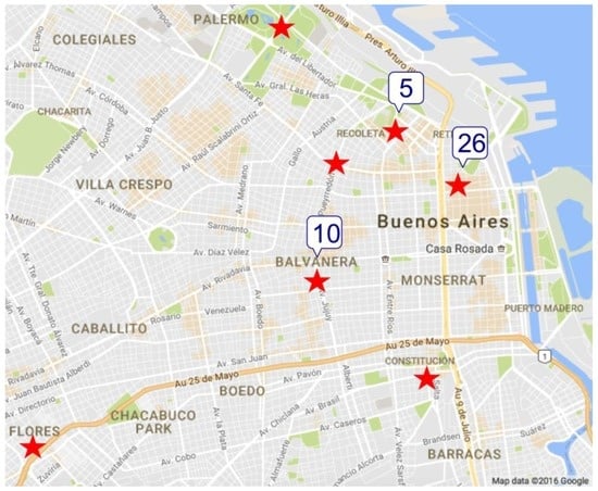 Interview locations in Buenos Aires. Red stars indicate approximate areas interview participants identified as places where sex workers concentrate. Numbers indicate number of sex workers interviewed in the area. Map from Google Maps.