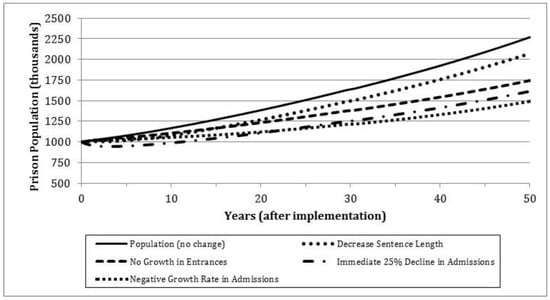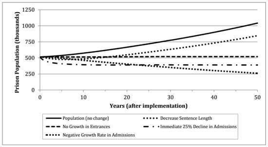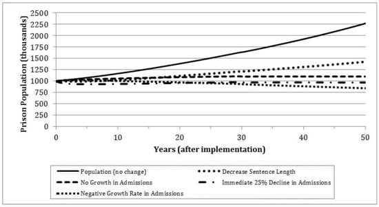- Examine what happens if zero growth in admissions is achieved. This means admissions would be the same from year to year. Policy changes such as using alternatives to incarceration for some offenses might lead to this result. For example, if the year to year variation in admissions resulted from drug offenses, rerouting this group to drug courts where the penalties consisted of probation and/or some type of rehabilitation and life skills workshops would make the number of admissions to prison stationary year to year.