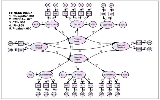 With regard to positive perceptions, the residents opined that economic indicators are the most important element in tourism development. They believe the presence of tourism creates new business opportunities for local residents (Factor loading = 0.75) and improved employment opportunities (Factor loading = 0.64). For socio-cultural factors, we presume this construct as the reference point for the main construct (positive perception), so that the result of the regression weight can be identified. If the reference point is not stated, the calculation will be a stop criterion due to the identification problem. Next, we found out that the local residents agreed that environmental impact can be influenced by tourism development. They believe that tourism has improved the area appearance (Factor loading = 0.70) and is capable of providing an incentive for the restoration. Therefore, residents tend to have these benefits in mind when considering tourism impacts.