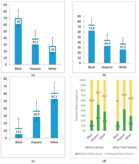 Percent of Respondents Indicating: (a) Justice System Is Biased Against African Americans; (b) Zimmerman Would Be Arrested If He Killed a White Person; (c) Jury Reached Correct Verdict in Zimmerman Trial; (d) Followed/Did Not Follow Martin/Zimmerman Incident. Note: The error bars in Panels A, B, and C represent the standard deviation of the responses from the mean for that group. Shorter bars indicate less variance in responses.