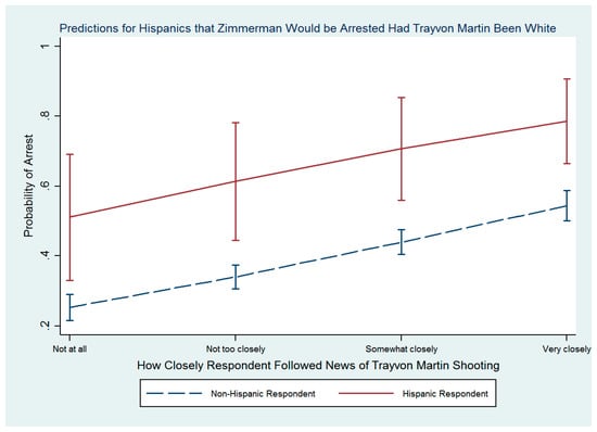 Media exposure produces a strong and statistically significant direct effect on whether respondents think Zimmerman would have been arrested had he killed a white person. The odds are 1.43 times higher that respondents with increased media exposure think Zimmerman would have been arrested sooner if he killed a white person, all else being equal. The effect differs depending on the racial or ethnic identity of the respondent and the degree of exposure as demonstrated in Figure 3 for blacks and Figure 4 for Hispanics. In Figure 3, we present the adjusted predicted probability along with 95% confidence intervals for blacks that Zimmerman would have been arrested had Trayvon Martin been a white victim. For blacks who are not following the news accounts of the incident at all, the probability is roughly 51% that they would hold the opinion that Zimmerman would have been arrested had Martin been white. This probability increases steadily to 72% for those blacks who follow the event very closely. For individuals at the low end of the media exposure spectrum, there is no statistically significant difference between blacks and whites since the 95% confidence interval bands intersect. Where significant difference begins to show between the two groups is at the point where respondents start to pay attention and begin to consult news outlets to learn about the incident. For both blacks and whites, media exposure to the incident increases the likelihood that Zimmerman would have been arrested had Martin been white but at significantly higher levels for blacks than for whites. Figure 4 reports a similar finding for Hispanics versus whites. In this case, the probability increases from 50% to 76% that Hispanics think Zimmerman would have been arrested as they receive more exposure to news accounts of the incident. We should note, however, that for this particular aspect of our study, media exposure does not have a differential effect based on racial identity. The interaction effects fail to reach acceptable statistical significance levels.