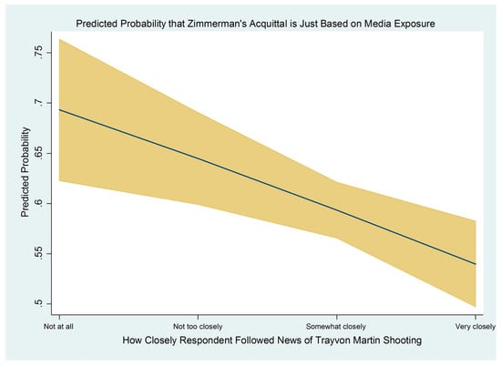 There is a noticeable improvement in the explanatory capacity of Model 4, which includes all the control variables. Relative to Model 3, the pseudo R2 value more than doubles in size, giving us greater confidence in the findings. Media exposure has a strong and robust effect on citizen evaluation of the Zimmerman trial verdict. The resilience of media exposure can be seen by noticing that this variable is statistically significant and quite powerful across all the models we estimated. In Figure 5, we demonstrate the direct effect of media exposure on whether the Zimmerman trial verdict is justified. The more exposure citizens have of media discussions surrounding this event, the more disheartened they become about the outcome. For respondents who did not follow the event at all closely, the probability is nearly 70% that they would approve of the outcome. This probability drops precipitously to 54% for those who followed the news very closely.
