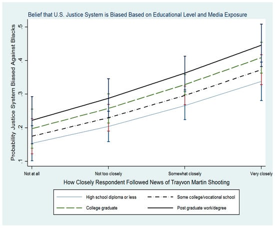 In Model 6, we include all the control variables along with perceptions of the Zimmerman verdict as an independent variable after checking for the possibility of correlated errors. As in previous models, blacks are significantly more likely to think that the justice system is biased against them compared to whites. However, there is no difference in this model between Hispanics and whites. Along these lines, Americans who are married, those with children under the age of 18, conservatives, and respondents who think Zimmerman’s acquittal was just are individuals less inclined to find bias in the justice system against African Americans. Among our control variables we find no support for differences in opinions about injustice based on the age of the respondents. However, there are several other control variables that are statistically significant. For example, we find the educational level of the respondent to be one of the most important determinants of attitude toward the criminal justice system. At all educational attainment levels, the more educated the respondent is, the higher their level of support for the idea that the justice system is biased against blacks. This level of support grows with increased exposure to the Zimmerman/Martin incident. Indeed, as shown in Figure 7, the probability of perceiving the justice system as biased against blacks is highly contingent upon the level of exposure to media discussions about the racially charged Zimmerman/Martin incident as well levels of education. Finally, we find no support for differences in opinion about injustice based on the age of the respondent.
