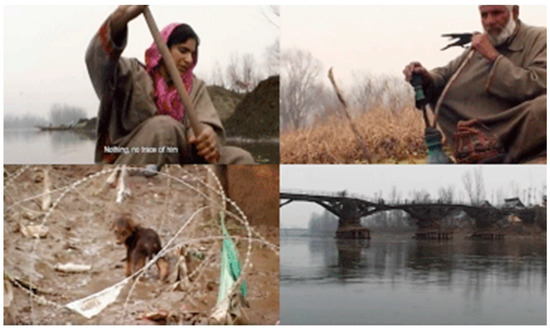 The film begins with a fade-in from black. We see Shamima Bano, whose husband Shabir ‘disappeared’, steering her boat through the backwaters of the quarters where she lives as a member of the Hanji community dwelling in the lakes of Srinagar (See Figure 1.). She speaks about the memory of her disappeared husband who came to her in a dream, saying, “I am Shabir”; she replied, “You cannot be Shabir, his face was the same, not his feet. I [Shamima Bano] tell him: I have put a mark on him […] we have to do a DNA test.” Next we see some images of the flora and fauna of the lake in winter. Shamima continues to recount her dream: Shabir tries to reassure her that it is actually him, but she tells him “No, no, no, we’ll take blood from your father and test it to find out if you are his son, I woke up, my god what did I see”. The boat passes by a group of men sitting in boats at the shore of the waterway. There is the close-up of one of them smoking his water pipe quietly while a little bird magically lands on his right shoulder. The next images show a few dogs—one puppy lost between barbed wire—and two children standing at the shore of the lake. We hear Fatima’s voice asking Shamima, “Did you ever hear anything about him?” She replies: “Nothing, no trace of him.”