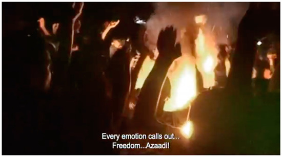 Fatima’s film is distinctly organized around spatial moments. The women in Khoon Diy Baarav are depicted through the logic of “walking with”, where in the process they show through carefully chosen actuality footage of everyday occurrences (e.g., encounters with the military, work in the field, walks in the forest, a wedding ceremony) the scars of conflict and their hopes for redress. During the production of the film, Fatima’s own movements within the valley had also been at a certain risk, when she was—together with members of her crew—for one day imprisoned in an army camp for shooting footage of its surroundings. Her high social status as a filmmaker from New Delhi and her networks in Kashmir have enabled her to get out of this relatively dangerous situation. Approximately the first hour of Khoon Diy Baarav is largely dedicated to making the viewer acquainted with four women of the APDP. By accompanying them and hearing about their disappeared family members, we learn about their desires and dreams. The second half of the film is marked by highly emotive sequences of mass protest and mourning. Since these kinds of images are strongly contested, one could be tempted to read them—following Kevin Smets typology—as taking part in “victim cinema” where filmmakers share certain beliefs of patriotism via the victimization of their own group (Smets 2015, p. 2442). For Smets, following Bar-Tal (2003, p. 85), it is a cinema of “affected parties” (Smets 2015, p. 2442). Even though members of Fatima’s audiences have sometimes commented on the one sidedness of her position (in favour of azadi) or tried to transcend the political intend of the images by referring to a shared humanity, I like to show that attempts to categorize her film as victim-centric, humanitarian or as being driven by ressentiment would fall short of the particular way the film is mediated in relation to highly affective images.