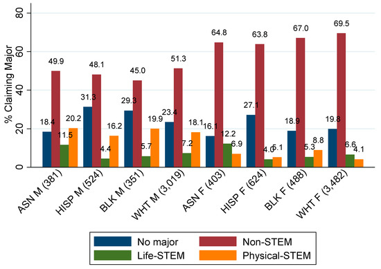 - Riegle-Crumb, Catherine, and Barbara King. 2010. Questioning a White Male Advantage in STEM: Examining Disparities in College Major by Gender and Race/Ethnicity. Educational Researcher 39: 656–65. [Google Scholar] [CrossRef]