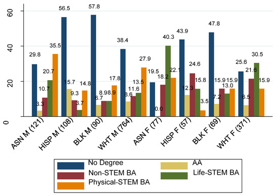 Gender and Race Disparities in Traveling the Non-Dominant Path of STEM Degree Attainment (N = 1,013). Note: Data is from NELS:88-00 postsecondary transcript data. The sample size includes all with the STEM bachelor’s degrees by 2000. The parenthesis includes the sample size for each group.