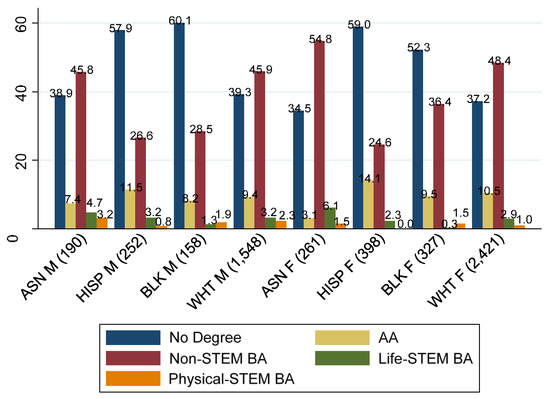 Figure 2 shows the group patterns in STEM bachelor’s degree attainment. The NELS data collected entry information (initial college major choices) in 1994, and the degree attainment information in 2000, eight years after high school. Figure 2 shows that among the 9272 students who were enrolled in college in 1994, a significant number of them have no degrees six year later. Racial gaps are paramount. Over 65 percent of black males and 64 percent of Hispanic males have not obtained any degrees, compared with 33 percent of Asian females with no degrees—the lowest among all the groups. In terms of STEM degree attainment, Asian females have a higher rate of STEM degree attainment than all of the male groups, except for Asian males. Close to 20 percent of the Asian females have attained bachelor’s degrees in STEM fields, compared to less than 15 percent of white males and less than 10 percent of black and Hispanic males. Asian males still topped the chart, with 24 percent graduating in STEM. There are significant variations across STEM-subfields. In particular, Asian females have the highest representation in life-STEM fields among all race-gender groups, with over 14 percent of Asian females graduating from life-STEM fields. However, less than 6 percent of Asian females graduated from physical-STEM fields and they trailed behind every male group, except for Hispanic males. Physical-STEM fields seem to be daunting for all females, with Asian females most represented (less than 6 percent) among all females. Although black females surpassed Asian females in their tendency to choose a physical-STEM major, they were left behind when it comes to degree attainment.