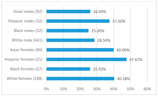 Gender and Race Disparity in Entry into science, technology, engineering, and mathematics (STEM) fields (N = 9272). Note: Data is from National Education Longitudinal Studies (NELS:88-00) postsecondary transcript data. The sample consists of all the postsecondary participants, based on transcript data, who also identify as one of the four racial/ethnic groups: non-Hispanic Whites, non-Hispanic Blacks, Hispanics, and Asians. The parenthesis includes the sample size for each group.