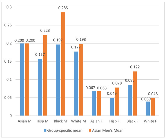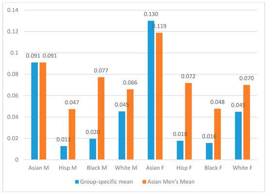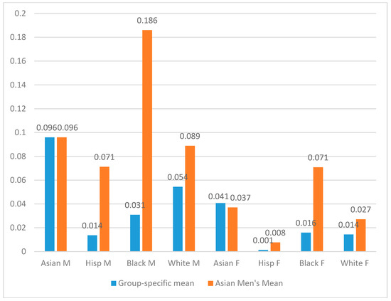 Figure 8 and Figure 9 present the predicted probabilities based on the logistical regression of STEM degree attainment for life-STEM and physical-STEM fields respectively. Similar methods were used as in Figure 6 and Figure 7 to compare the predicted probabilities before and after setting the mean at the level of Asian men, in terms of family and academic background variables. Figure 8 has shown that salient changes took place for both black males and Hispanic females. The predicted probability has jumped to 0.077 from 0.02 for black males to graduate in life-STEM fields after taking on the mean of Asian male’s academic and family background. The increase for Hispanic females from 0.018 to 0.072 is also quite remarkable. Figure 9 focuses on physical-STEM fields. It has shown the most striking changes for black males. The predicted probability for black males to graduate in physical-STEM has jumped to 0.186 from its previous 0.031, had they had the family and academic attributes of Asian males. Notably, the predicted probability of Asian males to graduate in physic-STEM fields is 0.096, only half of the level of black males with Asian characteristics.