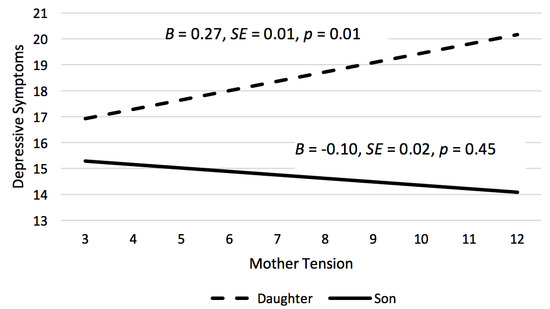 Model 2 in Table 4 presents the results of the moderating effects of gender on the associations between tension with spouses, mothers, and siblings and depressive symptoms. As we hypothesized, gender moderated the association between tension with mothers and depressive symptoms (b = 0.37, p < 0.05). Specifically, as shown in Figure 1, tension with mothers was more strongly associated with higher depressive symptoms for women than men. However, contrary to expectations, gender did not moderate the association between psychological well-being and tension with either spouses or siblings.