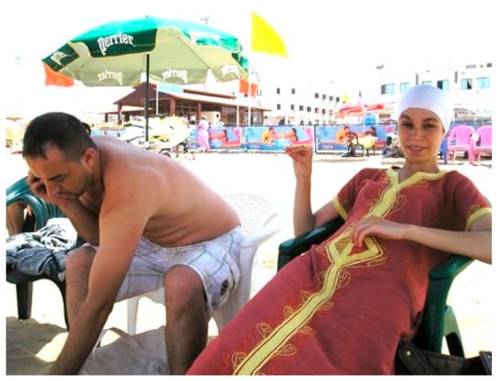 Calling that practice ‘risqué’ is a diffractive judgement made through ethnographic experience. While for DVs gondorras may seem an ideal beach cover-up—long, loose, comfortable, yet unique and fashionable—for others in Morocco they are more commonly worn in the same way most ‘traditional’ Moroccan clothes are worn, as the topmost in a series of layers. They may be similarly associated with leisure and comfort for resident Moroccan men, to the extent that in families where I have been present I observed men wearing them on their day off from work. In parallel, I have seen resident Moroccan women wearing them as they work around the house, or visit nearby neighbors, but not to go further than the immediate neighborhood; not out into the city, or to the beach, as DVs do. In addition, they have material features that, to maintain ‘modesty’, require them to be worn over something else: male versions, for example, come with side holes instead of pockets so that one can access an interior trouser pocket, and female versions, though more bright and colorful, are still too thin of a material to wear solo.
