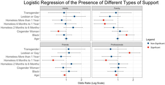 Odds ratios and 95% confidence intervals for the logistic regressions predicting the presence of the four different types of social support are presented in Table 2. To aid with interpreting these results, the coefficients are also plotted visually in Figure 1. Compared to cisgender men, cisgender women were less likely to have social support from adults (O.R. = 0.70, p = 0.04). Compared to non-black individuals, black individuals were more likely to have support from family members (O.R. = 1.48, p = 0.02). Individuals who self-identified as lesbian or gay were more likely to have support from professionals (O.R. = 1.69, p = 0.02) compared to individuals who did not identify as lesbian or gay. For three of the social support mechanisms, there was a significant negative effect between the duration of homelessness and support status. Compared to those who reported being homeless for less than one month to two months, those who were homeless for six months to one year (O.R. = 0.55, p = 0.02) and more than one year (O.R. = 0.52, p = 0.003) were less likely to have support from family members. Similarly, those who were homeless for six months to one year were also less likely to have support from friends (O.R. = 0.55, p = 0.02) and professionals (O.R. = 0.58, p = 0.04).