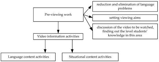 In realization of audiovisual technology based on video information, it is necessary to distinguish the following stages: previewing—statement of the purpose of viewing, the formulation of tasks, removal of lexical and grammatical difficulties; video information presentation—primary viewing; viewing repetition if necessary; after-viewing including: the control of understanding having various purposes and forms; formation, development and perfection of the foreign language communicative competence on the basis of lexical, grammatical and cultural video information maintenances; total control; actualization of the foreign language communicative competence as a result of work with video information.