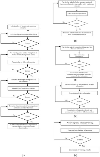 (a) Algorithm of foreign language training process based on video information (illustrative viewing); (b) Algorithm of foreign language training process based on video information (fact-finding viewing); (c) Algorithm of foreign language training process based on video information (studying viewing); (d) Algorithm of foreign language training process based on video information (critical viewing); (e) Algorithm of foreign language training process based on video information (search viewing).