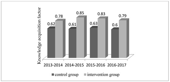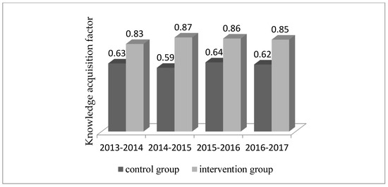 Knowledge acquisition factor for control and intervention groups for three years of training.