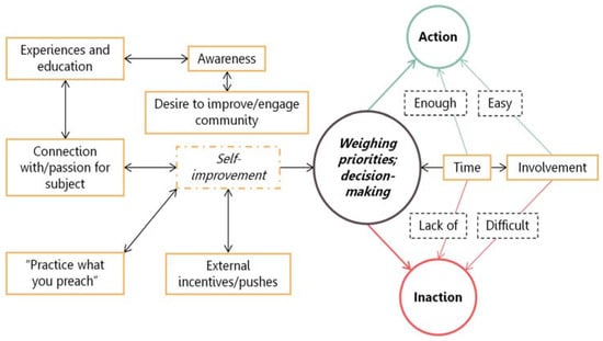 In this section, results are presented around two central themes that address the sub-research questions “Why might self-identified environmentalists (SIEs) choose not to take action on their concerns (environmental or otherwise)?” and “What thresholds or barriers, if any, exist for taking action? Why?” To answer these questions, we draw on two important codes from our transcripts—“time” and “involvement”—which are depicted in the two yellow rectangles on the right side of Figure 2.