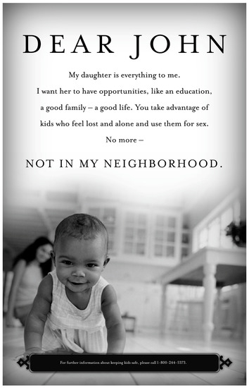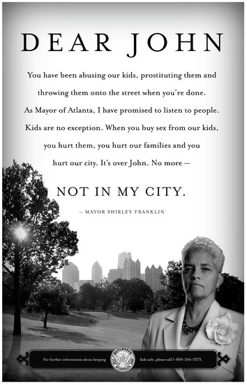 But while Dear John offers highly gendered portrayals of girls and young women in the sex trades, the campaign is more ambiguous in its presentation of their race. The campaign’s supporters believed African American girls and young women faced the highest risk for CSE in Atlanta: they appeared most frequently in juvenile court (and thus to arresting officers) and in Hidden in Plain View. Yet this population was not featured visually or verbally in Dear John: the text only mentions “girls” (without reference to race, which lends itself to a presumption that victims are white), and the only images of people of color in the ads are of the Mayor, the baby’s mother, and the baby.