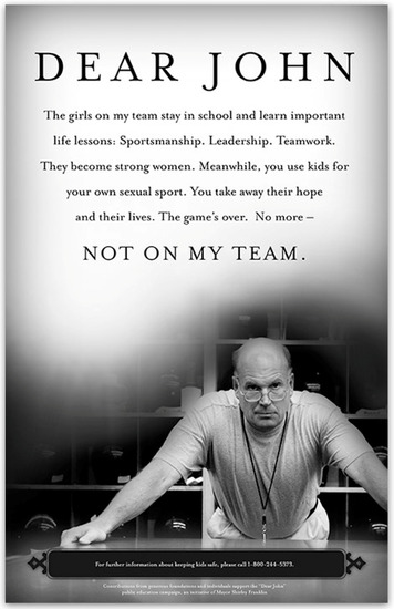 If Dear John’s narrative indicates that girls and young women are the most common victims, who are the villains? Since “The substantive focus of the campaign was on the buyers of sex and reducing demand” (Edelman & Associates 2008, p. 3), the villains are presumably men, as indicated by Dear John’s direct and consequential text in the form of a “Dear John” letter. Yet Dear John did not use the gendered and racialized imagery and language to describe these men that scholars have observed in other campaigns, such as criminal African Americans (Bernstein 2010), “brutal Eastern Europeans”, or “rapacious Africans” (Doezema 2010, p. 1). In fact, men who purchase sex are not physically visible in Dear John. Instead, respectable and archetypal members of the community—the Mayor, a coach, and a mother—are symbolically sending such letters to men who may purchase sex, telling them that they have “moved on” from their behavior; they will no longer accept or tolerate it. As Nina Hickson explained, this focus on men was meant to “promote the message that men who bought kids would not be supported; they needed to be accounted for and put out there—shamed” (Interview, 6 January 2014).