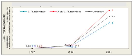 Trend of capital requirement for Nigerian Insurers, 1997, 2003, 2005. Source: NAICOM, 2015.