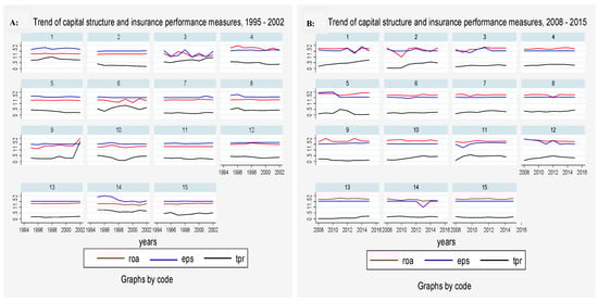 From the above figure, panel trend indicating relative stationarity of key variables: ROA, EPS and TPR during NRBC regime (1995–2002) and RBC regime (2008–2015) are illustrated in Figure 4A,B respectively. Comparatively, during NRBC regime, we observed a downward parallel trend with less volatility in ROA and EPS, whereas both measures moved interactively upward with relative high frequency during RBC regime. Concerning TPR, in NRBC regime, the variable trended downward to the right with high volatility and far below RAO and EPS. In RBC regime, it trended upward to the right with less volatility and far below ROA and EPS. The implication of the analysis is that during NRBC regime, insurance performance seems to maintain relative stability in growth whereas in RBC, it shows instability. It may follow that the different volumes of TPR held by insurers during NRBC allows for a stable growth in performance while it cause fluctuations in performance during RBC regime. In both scenarios, TPR exhibited some changes that tend to reflect the stationary property or nature of our research variables which is common among panel data (see Hlouskova and Wagner 2006).