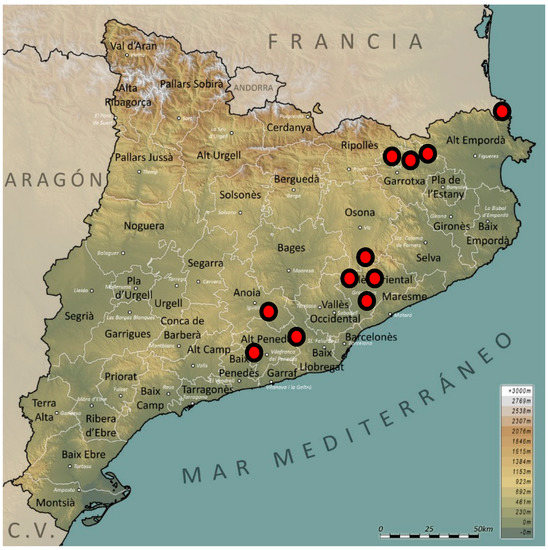 Location of EICs where we conducted interviews. The scheme shows the approximate geographic distribution in Catalonia of the Environmental Intentional Communities used for data collection through interviews. Each red circle symbolizes a community. Source: Prepared by the authors.
