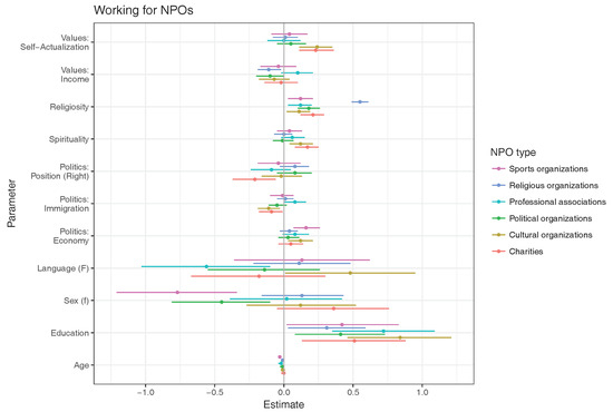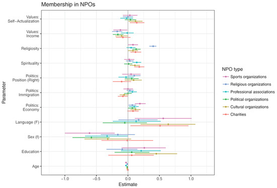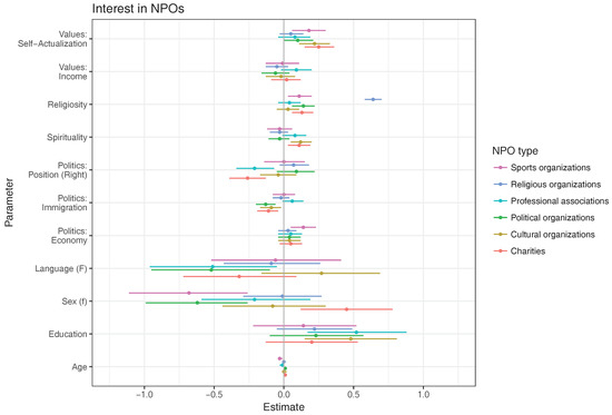 The estimation results for the six models with general interest in NPOs as the response variable are summarized in Figure 1.