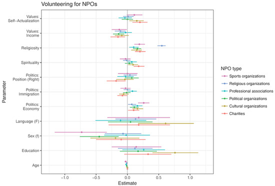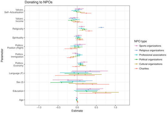 We present the results of the model estimations in graphical form. In each of the following subsections, the chart of interest contains the model estimates for one of the five dimensions of attitudes towards NPOs. The model estimates for the six different NPO types per response variable are all contained within a single chart; the different NPO types can be discerned by the different colors.
