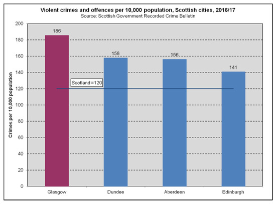 Peer pressure to conform is especially significant in affecting behavior and attitudes during adolescence. The presence of others, including their support or otherwise, such as anti-social peer affiliation, strongly impacts behavior (Quin et al. 2018). Adversity and tension are negatively experienced and often problematic aspects of life, wherein sometimes they result in outcomes which are beneficial to society and individuals, but sometimes they change lives for the worse by promoting a criminogenic coping strategy. Poverty and violence are associated throughout the world, creating conditions where anxiety and stress are indictors of the liquid modern. Glasgow, like other Scottish cities, includes socially deprived housing estates characterized by the enduring presence of street gangs (Bartie 2010; Bradshaw 2005; Davies 2013). Glasgow is arguably an ‘ideal-type’ for studies of adversity in terms of its intractable subculture of violence and celebrity criminals. Statistics for knife crime, rather than gun crime, are evidence of its distinctiveness; hands, feet, and head, and opportunistic weapons such as bottles are notable assault tools, often used to catastrophic effect (Davies 2013; Deuchar and Holligan 2010; Holligan and Deuchar 2014; Deuchar et al. 2014; Patrick 1973). Glasgow has more street gangs composed of mainly white teenage boys than anywhere else in the UK. The following graph below (Figure 1) offers official data and depicts Glasgow’s significantly higher crime statistics in a Scottish context.1