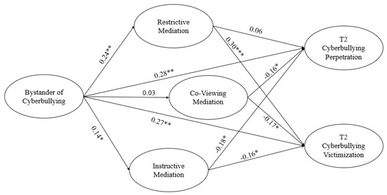 The measurement model was examined using CFA in Mplus 6.12. The model fit was adequate, x2 = 765.03, df = 703, p = n.s., CFI = 0.99, TLI = 0.97, RMSEA = 0.04, SRMR = 0.04; all standardized factor loadings were significant, ps < 0.001. Items for each questionnaire served as indicators for the latent variables in the structural regression model. The results revealed that the structural model fit the data adequately, x2 = 816.73, df = 789, p = n.s., CFI = 0.99, TLI = 0.98, RMSEA = 0.04, SRMR = 0.04 (see Figure 1). Increases in being bystanders of cyberbullying was related positively to restrictive parental mediation (β = 0.24, p < 0.01) and instructive parental mediation (β = 0.14, p < 0.05). Bystanders of cyberbullying was related positively to T2 cyberbullying perpetration (β = 0.28, p < 0.01) and T2 cyberbullying victimization (β = 0.27, p < 0.01). Restrictive parental mediation was related positively to T2 cyberbullying victimization (β = 0.30, p < 0.001), while instructive parental mediation was negatively related to T2 cyberbullying perpetration (β = −0.18, p < 0.05) and T2 cyberbullying victimization (β = −0.16, p < 0.05). Restrictive mediation was unrelated to T2 cyberbullying perpetration (β = 0.06, p = n.s.). Co-viewing mediation was unrelated to bystander of cyberbullying (β = 0.03, p = n.s.), but it was related negatively to T2 cyberbullying perpetration (β = −0.16, p < 0.05) and T2 cyberbullying victimization (β = −0.17, p < 0.05).