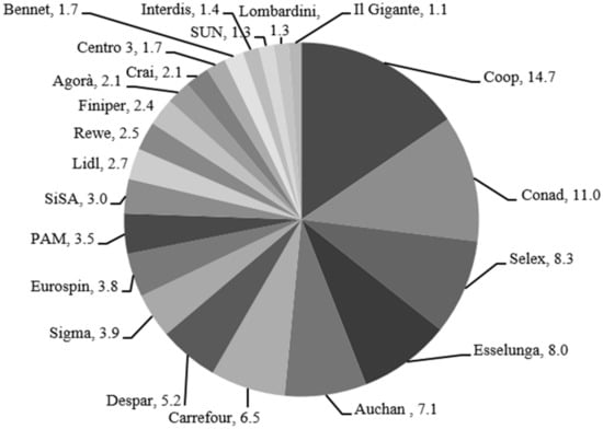 However, the centrality of local government remained unaltered in the trade sector, affecting the fragmentation of the market with dozens of operators active in the national context (Figure 1). Comparing the values of the C3 index with the major European countries, it is notable that in Italy the three largest chains held only 34% of the market, compared to 61% for the three largest chains in the English and German markets or 53–54% for the French and Spanish markets. It should also be noted that the largest share of the national market was in the hands of the so-called DO (organized distribution) (57.1% of the large retail market) rather than large national or global operators of large distribution (41.5% of the market). DO consists of local entrepreneurs who combined a plurality of small shops under one single label. The remaining share of 1.3% was occupied by so-called independent operators. This is an Italian peculiarity that favors the logic of transformation and efficiency for distribution systems on a national scale, while at the same time protecting the relationship with local business entrepreneurs. In this sense, the cooperative system best embodied this particular political choice, legitimizing its hegemonic role under large-scale cooperative brands such as Coop (14.7%) and Conad (11%). The cooperative movement was strong in Italy due to its privileged and direct relationship with the territory and the political support of local administrations, particularly those governed by the center-left. By promising a more equal and collaborative relationship with the supply chain and placing the territories at the center in line with socially responsible managerial logic, it encountered less resistance in its rise in the Italian regions.