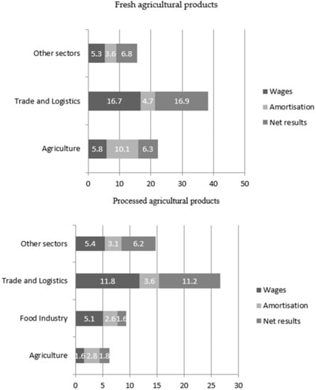 According to the Italian Institute for Agricultural Market (ISMEA 2018), in the Italian value chain of agricultural products the most vulnerable actors in the supply chain are producers(see Figure 2): out of every 100 euros spent by the consumer on purchasing fresh agricultural products, only 22 remain as added value to producers who must cover depreciation and pay the salaries, yielding a net profit of 6 euros, with the remaining 17 euros in the hands of commerce, distribution, and transport businesses. In the case of processed food, the net income is equally compressed, amounting to only 1.6 euros for farmers, while the net remuneration for commerce, distribution, and transport entrepreneurs remains at 11 euros.