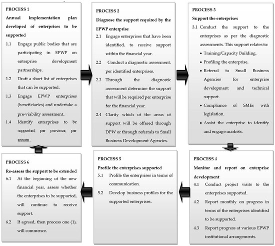The EPWP Enterprise Development Support Model. Source: EPWP policy on small, medium, and micro enterprises, (EPWP 2013).