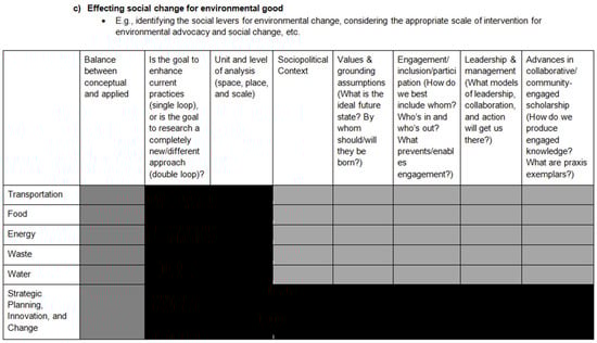 Framework tool for theme (c) Effecting social change for environmental good. Darkest cells represent intersecting research foci with most potential (see text above for further explanation).