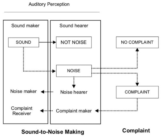 No sound is noise without the hearer’s consent of transforming it into an ‘unwanted’ sound. The same type of sound can be perceived as noise or not depending on the sensitivity, attitude, and perception of the individuals hearing the sound. Thus, sound-making is a neutral event (in Figure 1 it is indicated by the solid arrow lines), while noise is never value-free (indicated by the dotted arrow lines). A noise is the unwanted sound which people call or treat as ‘noise’, within what kinds of activity noise occurs (Stokoe and Hepburn 2005), when and where the sound is heard as noise, and who makes the sound regarded as noise, and so on.