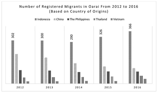 Number of registered migrants in Oarai from 2012 to 2016 by country of origin. (Data source: from a personal request to Oarai Town Office in 2018, graph by author.).