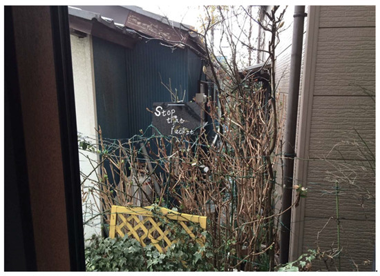 However, I was struck by the barbed wire and a hand-written sign in English reading “Stop that racket” facing into the entrance door of the door (see Figure 3), from where I could also see the neighbors’ wall and gap amongst the houses. The migrant’s house does not share a wall with the neighboring houses, and there is a one-meter pathway between the walls. When I asked Priscilla’s brother, who also lived there, about the sign, he explained it briefly in a relaxed manner: “Oh, it has been there for a while, because our neighbor is urusaii (noisy), so mama-san (the wife of shachou) was angry and put the sign. We don’t know what it means, though. What is ‘racket’? We don’t understand [its meaning].”. It was surprising to see the sign and the wires, which made it appear like a “no trespassing” sign for animals. In Priscilla’s brother’s understanding, mama-san put up the sign for the neighbor, not for him and his families. He said that mama-san was angry at the neighbor because the latter was urusaii. Priscilla’s brother did not see this sign as an offense to him because of this understanding and not understanding the meaning of ‘racket’.