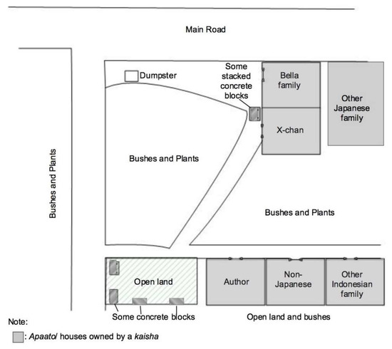 The kaisha owning the complex was about 150 m from my rented apaato (see Figure 4). Hence, the complex of apaato was meant to be rented for the kaisha’s workers17. It was my first time living in an apaato in Japan; I used to live in a mansion. My first impression was that there was no privacy or secure feeling: the front door was the only border from public to my private space; conversely, in a mansion, there is a pathway for the residence outside the door with a 24-h security and a locking system in the building. The other side of this apaato, the windows, is also connected to the public space with no boundaries. Thus, public noise intrudes easily into the apaato and vice versa.