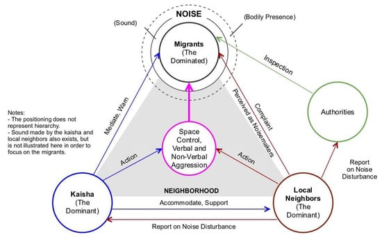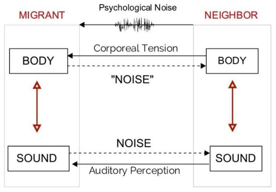 In the case of the five participants, even if their presence is not visible or seen, even if the actual noise is not heard, Japanese neighbors feel and perceive migrants’ bodily presence as loud ‘noise’. This is explainable by a concept offered by a French philosopher, Jean-Luc Nancy (1992) that “bodies resonate tension” (in Schulze 2012, p. 202). This tension “trembles” through the bodies of neighbors “as a tone” (Schulze 2012, p. 203). The foreignness of the body resembles the newness of the sound, which is then perceived as noise (see Figure 6). However, it needs to be underlined that this concept of ‘the body as sound’ is different to ‘sounds of the body’ or ‘body as the source of noise’, in which the two latter include the sounds of body parts or organs. A body is “a kind of space or container, which consists of many entities: mind, soul, words, emotions, thoughts, and so on” (Skara 2004, p. 185). ‘The body as sound’ means the bodily presence (of a migrant) resembling the sound’s presence, as it also includes high information content of cultural embeddedness, felt as tension.
